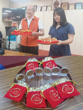 圖1:武龍宮主委王大明宣布10日午後來參加揭匾信眾,可獲武龍宮紀念幣。(記者鄭素梅攝) 圖2:武龍宮提供加持紀念幣贈送參加揭匾信眾。(記者鄭素梅攝)