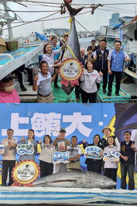 【記者許東宇/屏東報導】2026屏東第一鮪拍賣單價,再創新高!屏東第一鮪拍賣會8日上午10時在東港漁港魚市場熱烈展開,為今年屏東黑鮪魚文化觀光季拉開序幕,琉球籍漁船「富漁慶2號」洪福家船長捕獲的第一鮪重量190公斤、身長214公分,在超級拍賣官周春米縣長和藝人胡盈禎合力炒熱氣氛下,競標熱烈,最後由佳珍海產餐廳、澎坊股份有限公司聯手以每公斤單價10600元、總價201萬4000元得標,再度刷新第一鮪拍賣單價紀錄,得標的佳珍海產餐廳業者蕭受發也宣佈第一鮪收益將捐助弱勢兒童。 農業部政務次長黃昭欽、漁業署署長王茂城、海洋委員會海域安全處處長陳朝陽、海巡署艦隊分署分署長黃宣凱、海巡署南部分署副分署長黃瑞原、美國在台協會(AIT)高雄分處處長張子霖、日本台灣交流協會高雄事務所所長奧正史、屏東縣議會前議長林清都、屏東縣議員林蔡鳳梅等人連袂出席拍賣會,現場更擠滿了爭睹第一鮪風采的鄉親。 周春米縣長表示,「富漁慶2號」漁船船長洪福家捕獲的黑鮪魚,是第一鮪認定標準自4月1日起實施起魚全程錄影、海上去鰓保鮮新制後捕獲的第一尾黑鮪魚,不僅是2006屏東第一鮪,更是台灣第一鮪。屏東舉辦黑鮪魚季文化觀光季以來已經26年,第一鮪拍賣則進入第25年,實屬不易,感謝中央與地方的努力,更歸功於護漁政策、生態永續責任的落實,帶來漁獲的豐收。 周縣長也恭喜67歲的「富漁慶2號」船長洪福家,原本是要捕捉旗魚,卻意外釣獲黑鮪魚,老船長技術果然不簡單。 壓軸的第一鮪拍賣會緊接開鑼,在縣長周春米和藝人胡盈禎賣力鼓吹下,台下承銷人出價熱烈,價格狂飆,最終由佳珍海產餐廳業者蕭受發以每公斤10600元、總價201萬4000元得標,刷新去年10300元單價紀錄,第一鮪公開拍賣25年以來,第12度得標的蕭受發表示,今年他與澎坊股份有限公司總經理常春媚聯手標下,他的第一鮪收益將捐助弱勢兒童。 今年屏東黑鮪魚季從第一鮪拍賣後正式拉開序幕,縣府已規劃自5月2日至7月5日舉辦黑鮪魚季開幕海洋音樂會,並規劃了美食推廣宴、大鮪市集、琉住你音樂會、經典之夜等活動,搭配在地商家優惠、高鐵假期旅遊,更提升活動豐富度,請大家拭目以待。